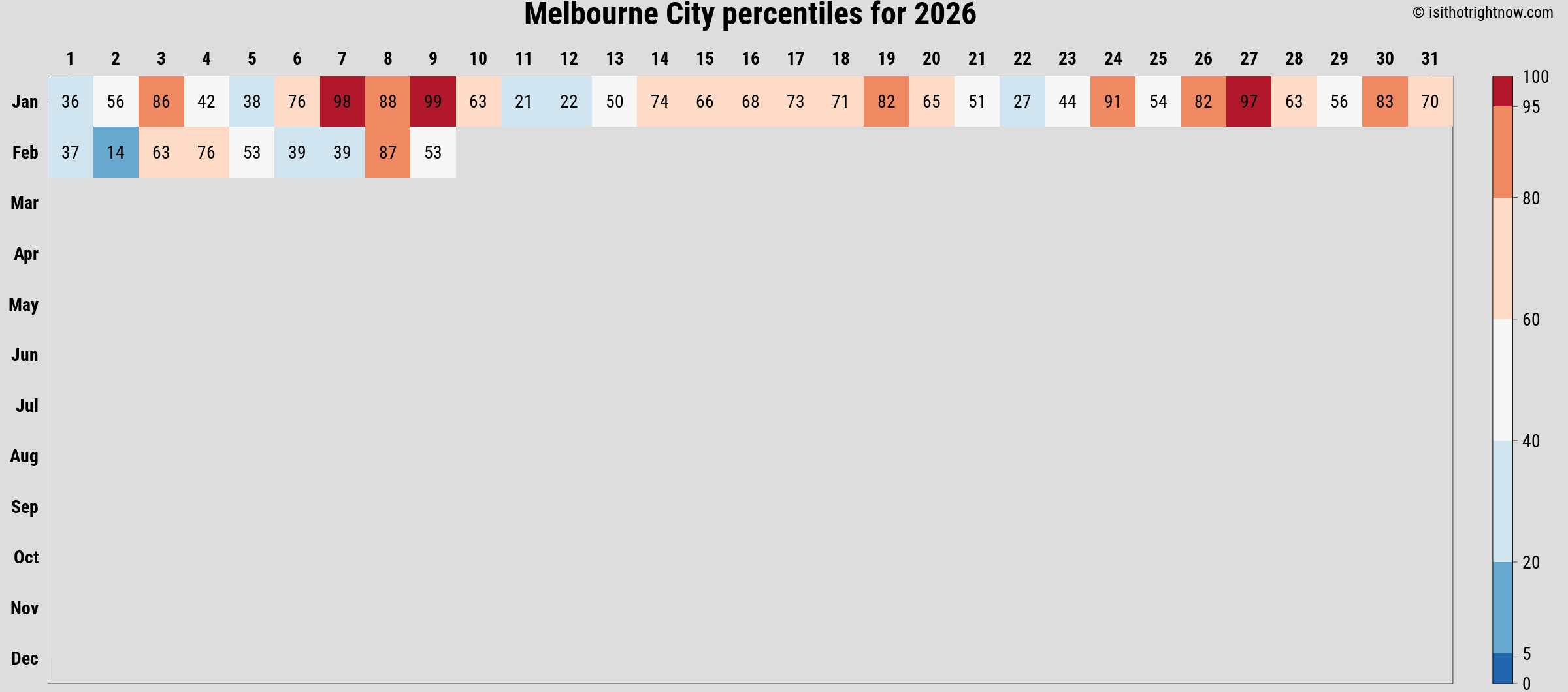 We’ve compared every day this year at Melbourne City to similar times of year in the past. Red days were hot compared to records; blue days were cold.